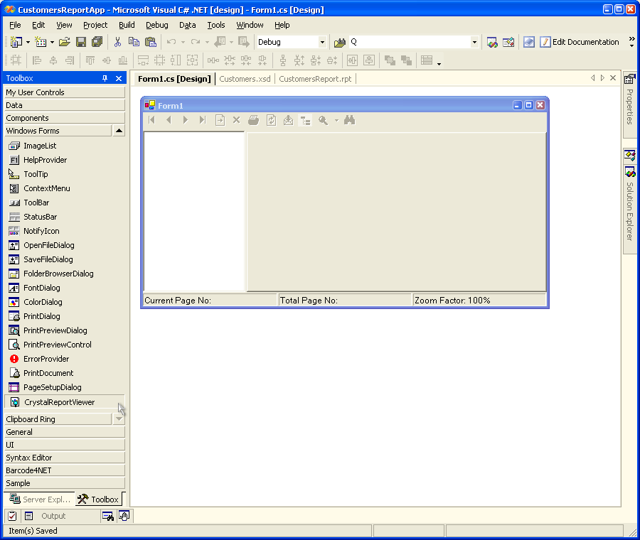 | 12. Display the application's main form in design mode. Select the CrystalReportViewer component in the toolbox and drag it on the form. |