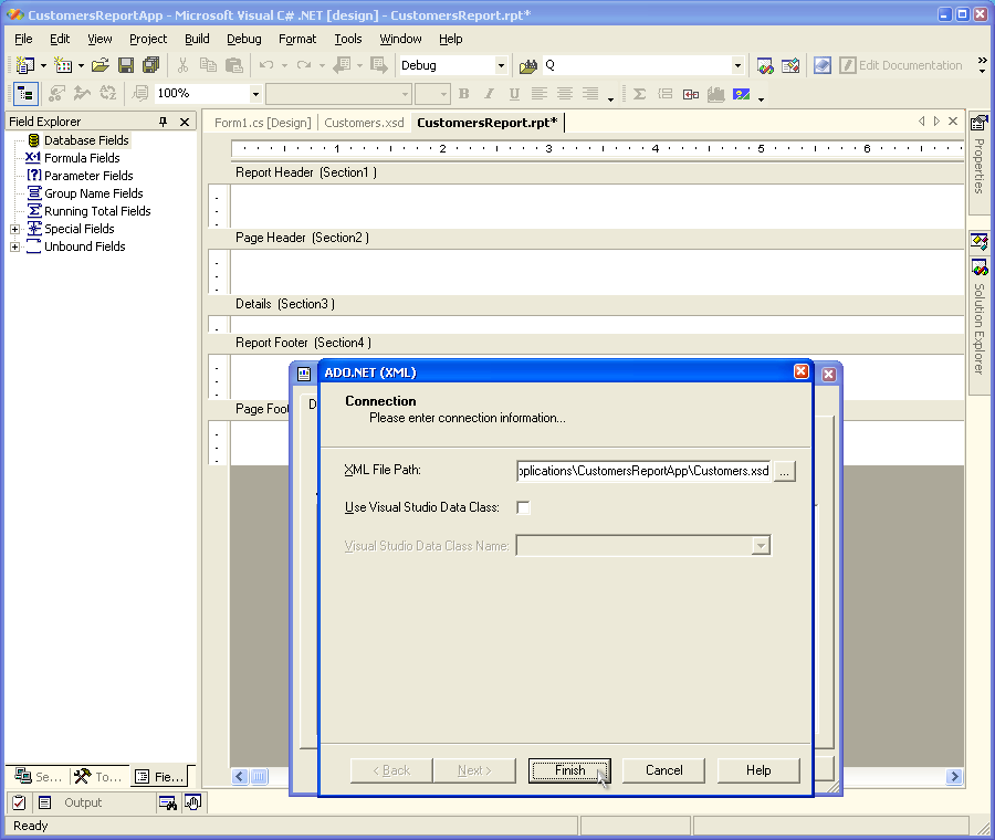 | 8. Expand the ADO.NET (XML) node and type the path to Customers.xsd file in XML File Path field and then click Finish. |