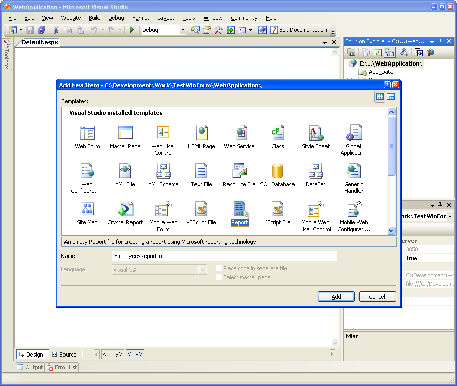 | 2. Using the Website menu (Website > Add new item...), add a new Report to the application. Name the report EmployeesReport.rdlc. |