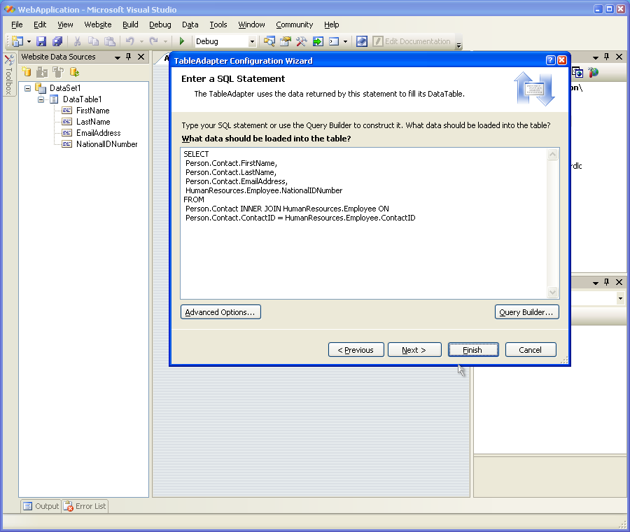 | 3. Add a new Data Source to the project and type the following code for reading the data from the database |