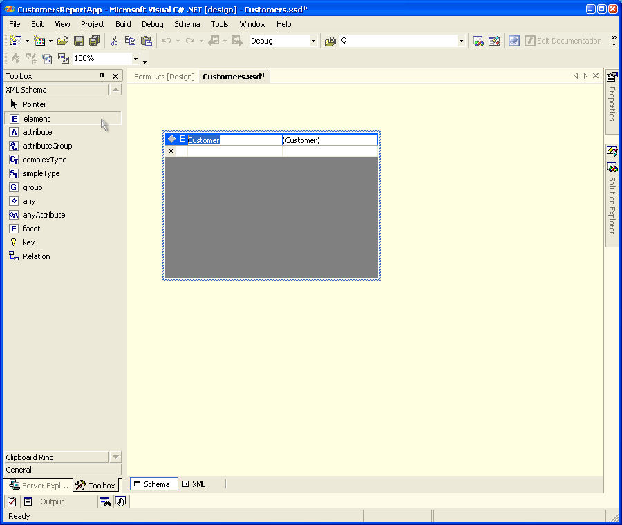 | 3. Make sure the XML schema is in design mode. Select the Element object in the toolbox and drag it on the schema. Name the element "Customer". |