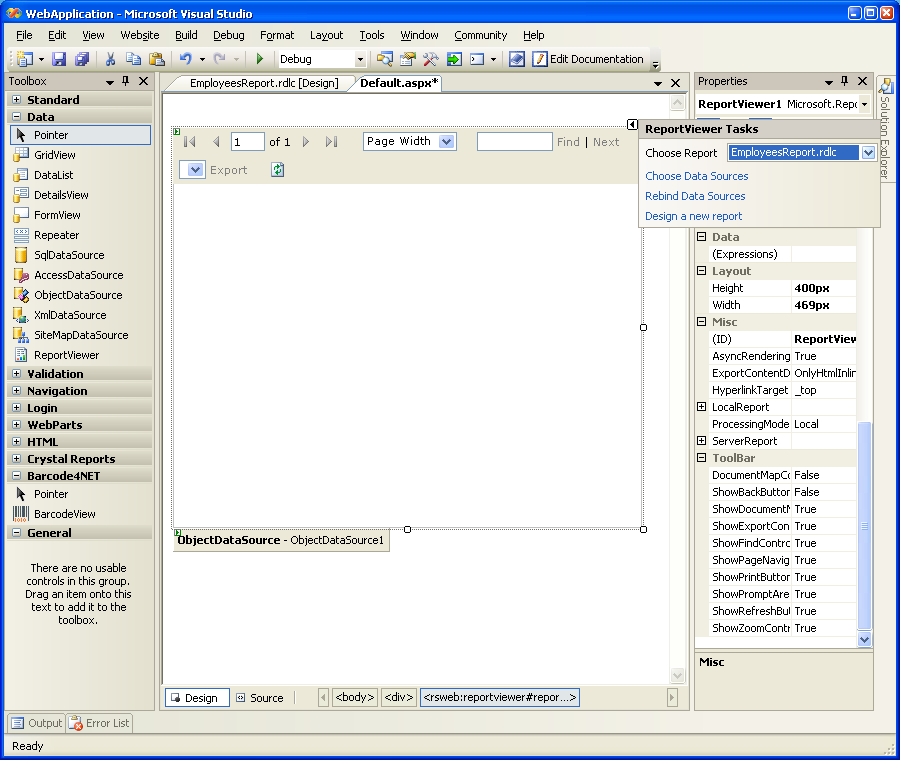 | 9. Display the application's default.aspx page in design mode. Select the ReportViewer control in the toolbox and drag it on the form. Select EmployeesReport to be displayed in the control. |
